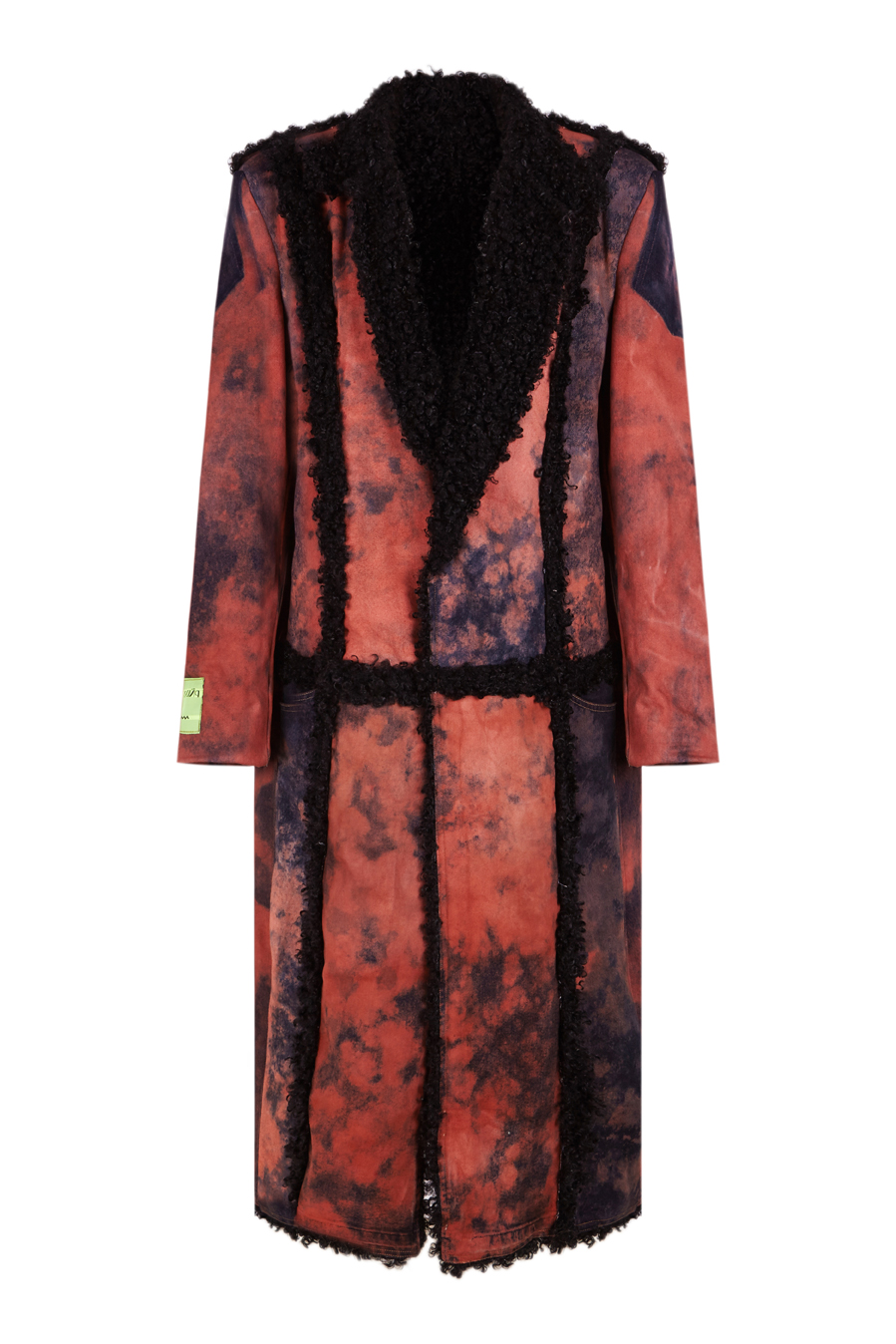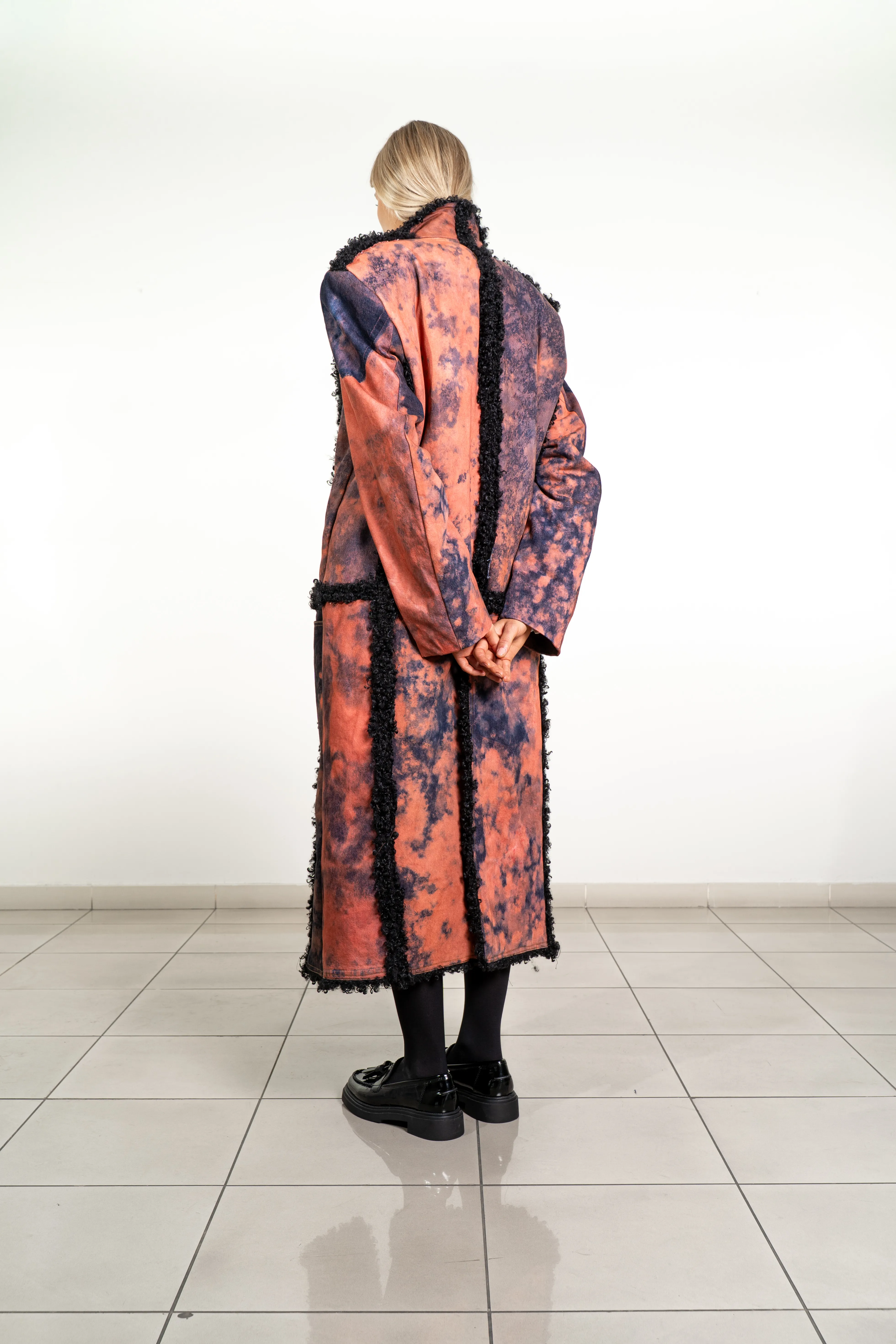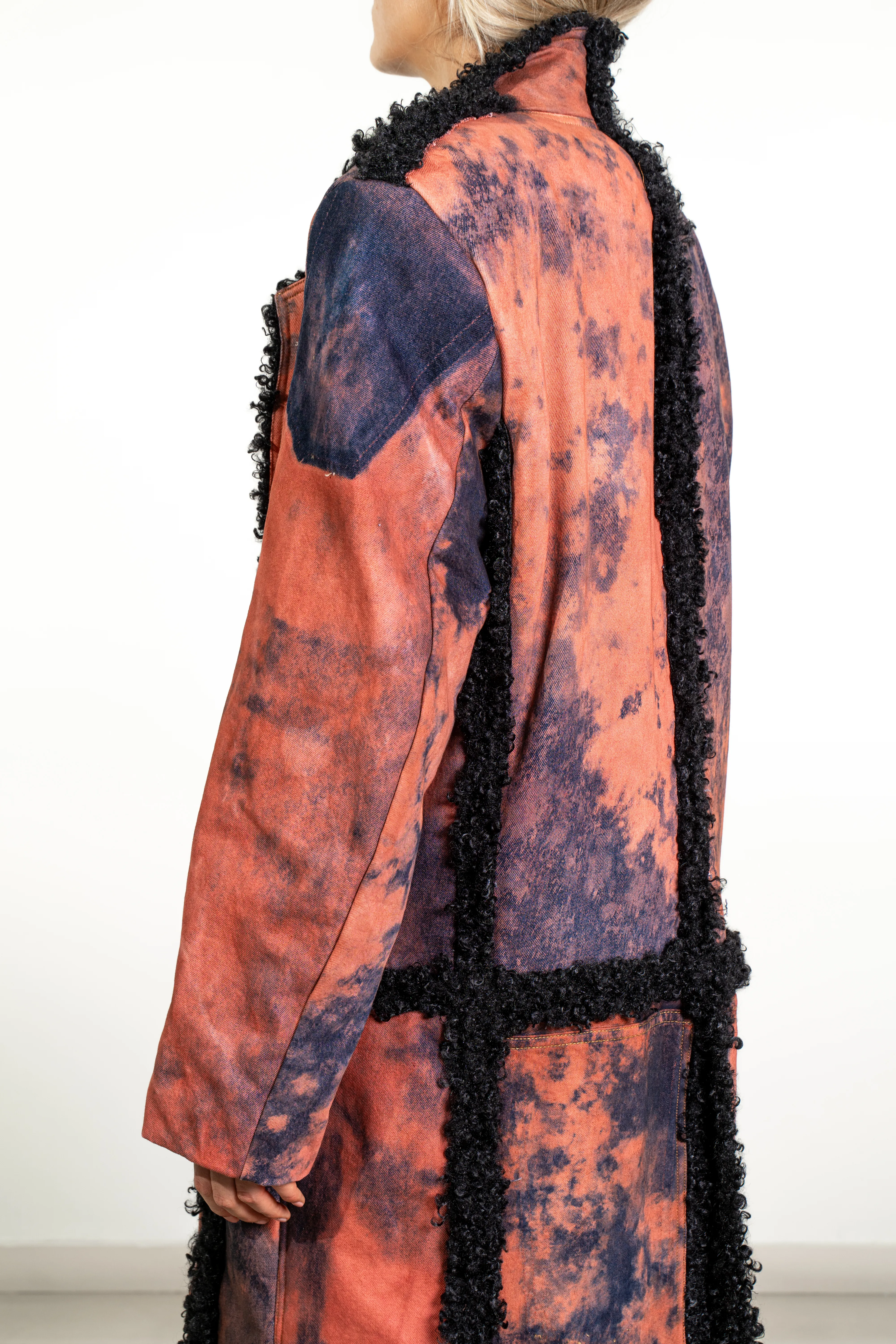Abrigo upcycled de largo medio-maxi, confeccionado en denim reutilizado y transformado mediante un proceso artesanal de desteñido en tonos teja y azul negruzco. Cada pieza es única gracias a su acabado manual.