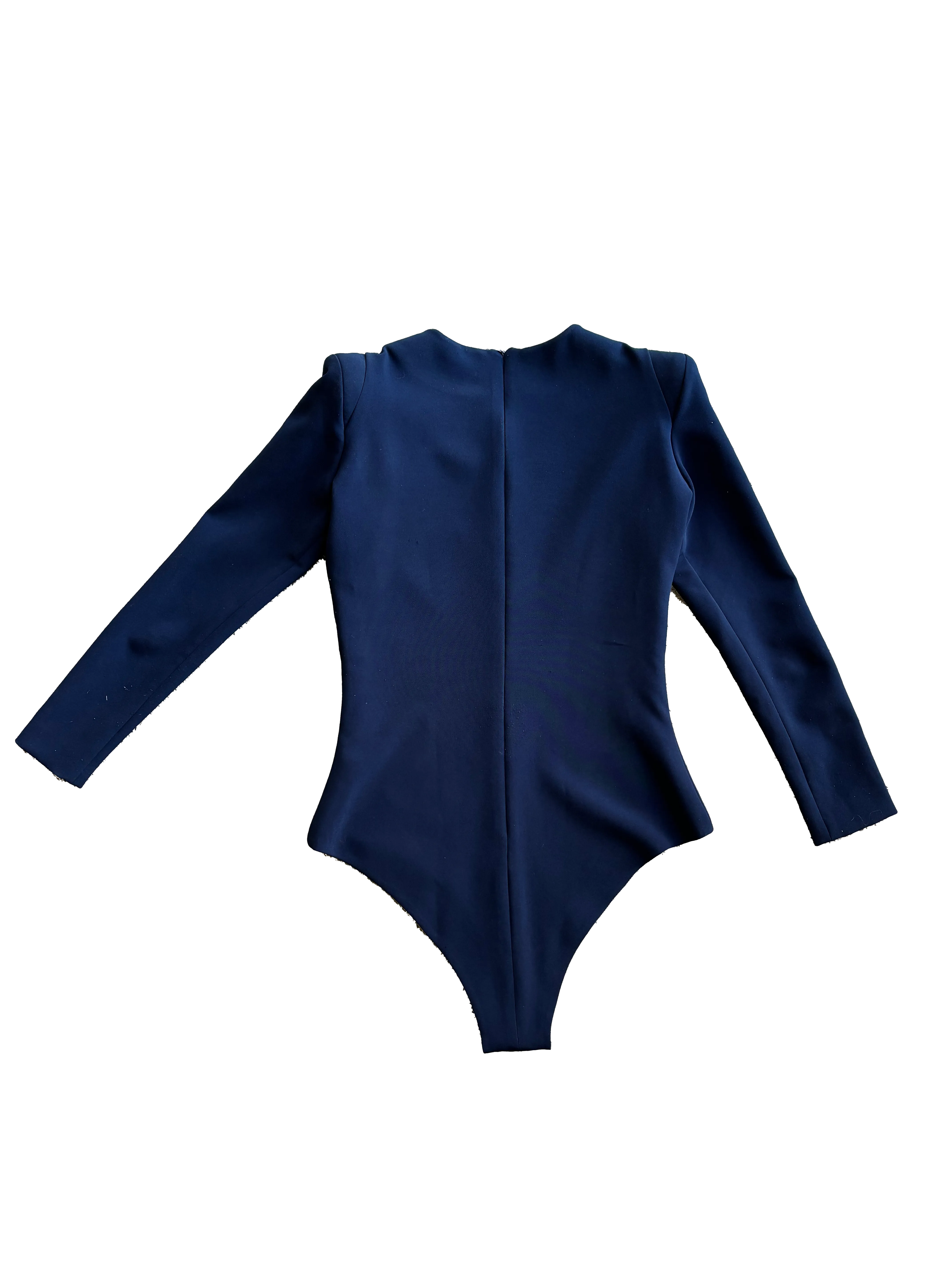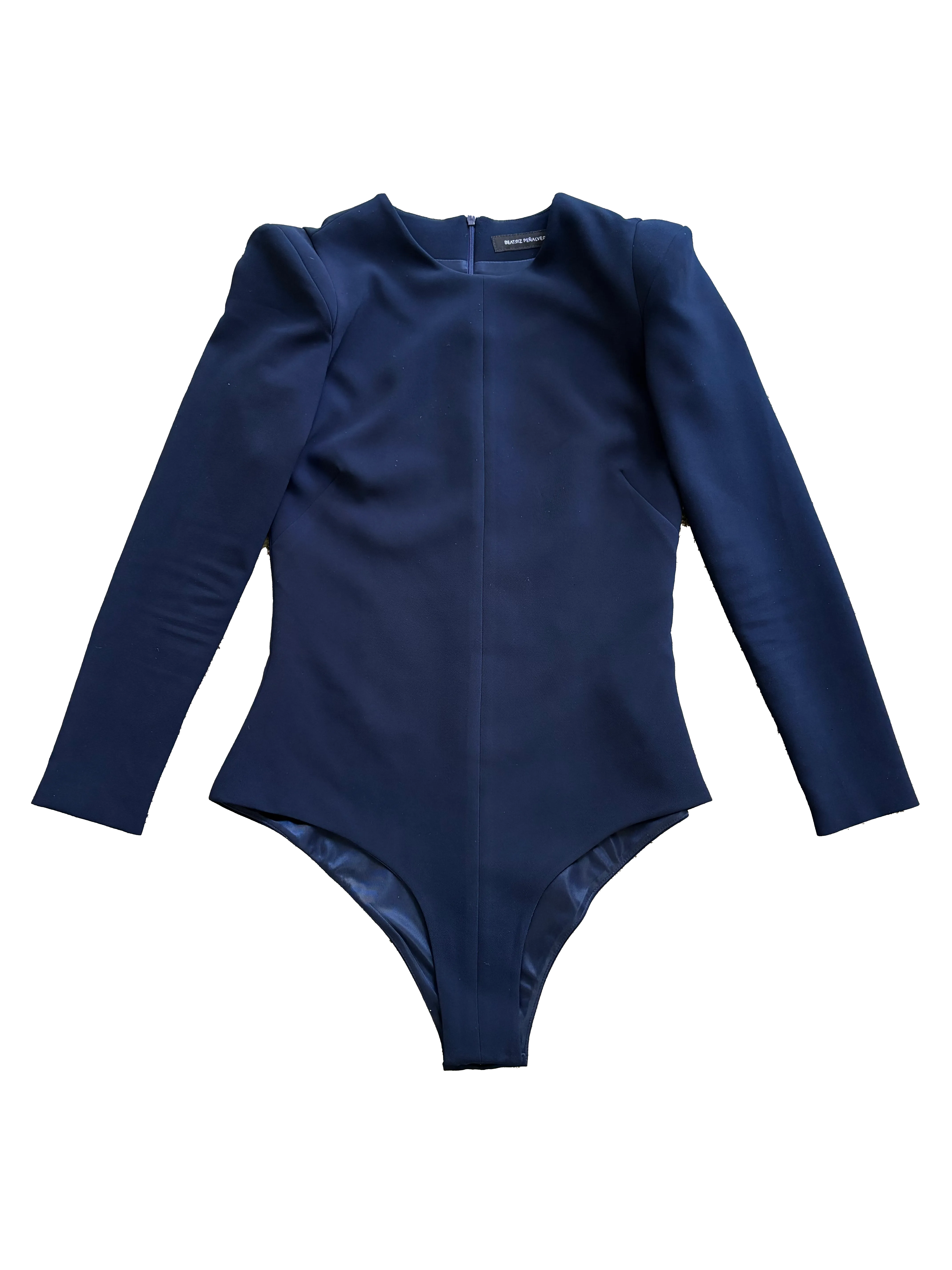 Body de cuello cerrado en color azul marino, diseñado con una silueta estructurada y hombreras que aportan presencia y un toque sofisticado. Su tejido firme realza la figura y ofrece un ajuste limpio, mientras que el diseño de manga larga y líneas minimalistas lo convierte en una prenda versátil para combinar en looks tanto elegantes como contemporáneos.