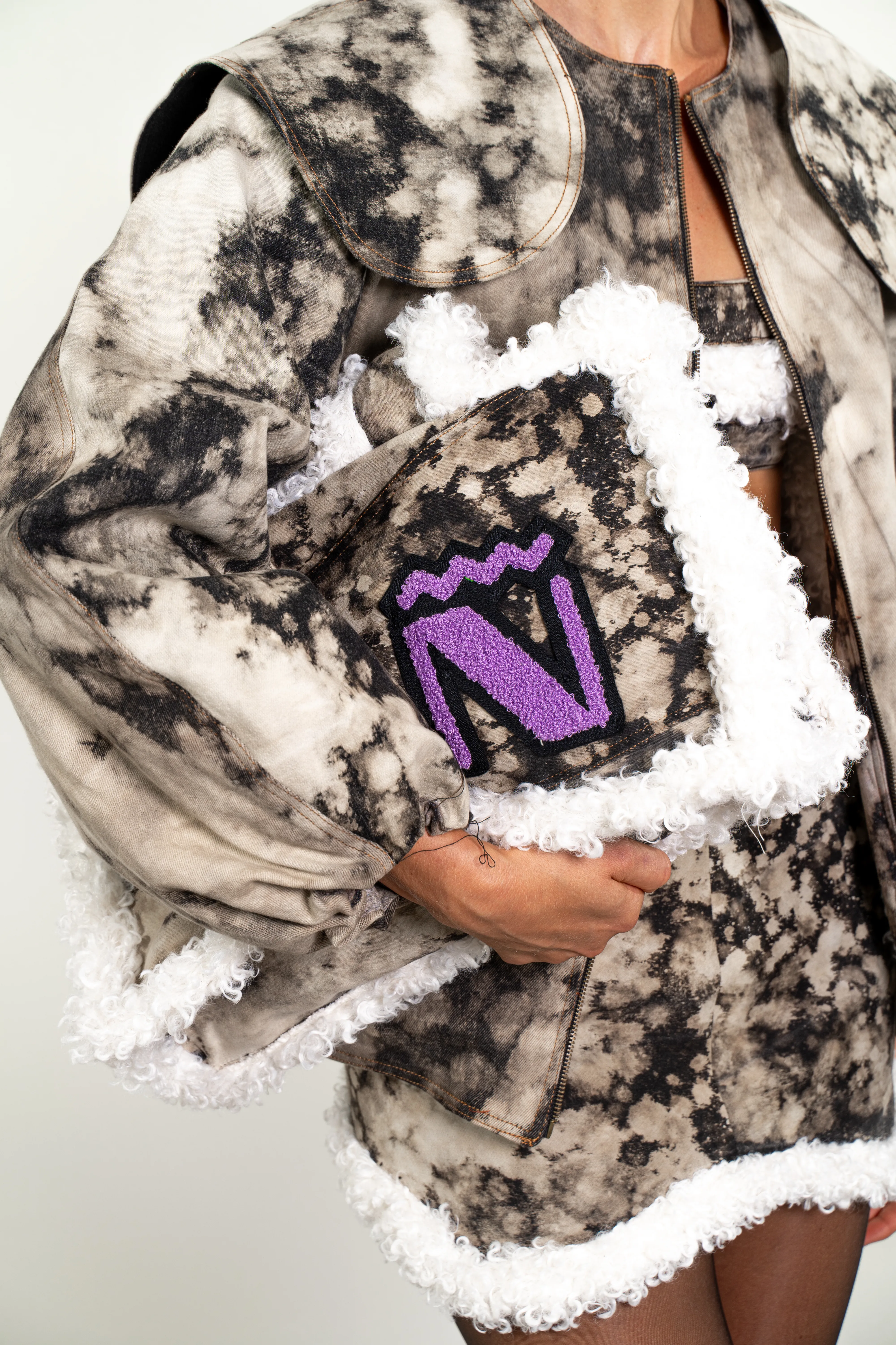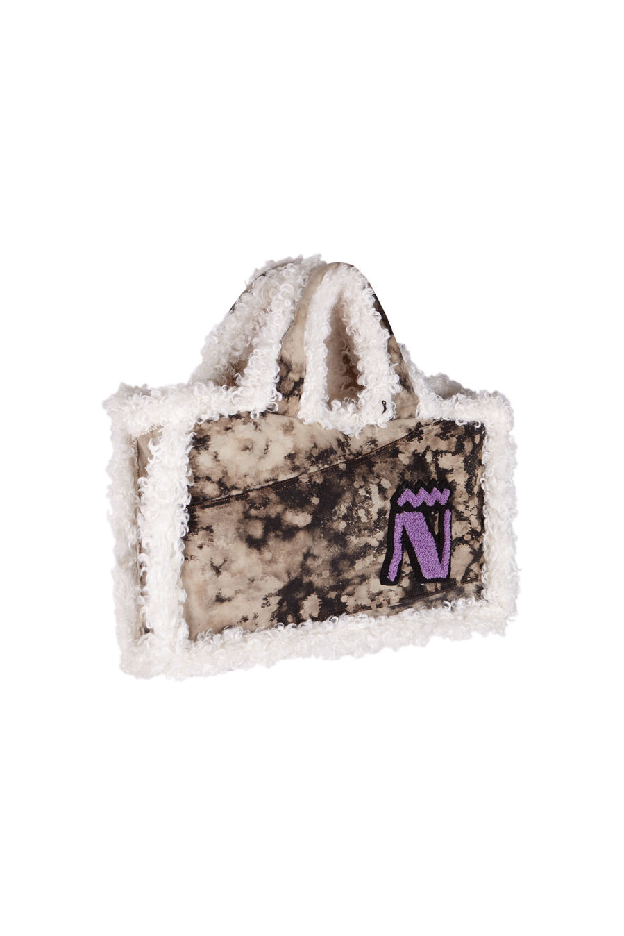 Bolso rectangular con asa corta y gran capacidad de almacenaje, rematado con biés de borrego orgánico blanco y logo en relieve en tono morado. Realizado con tejidos de vaqueros vintage reciclados mediante la técnica upcycling.