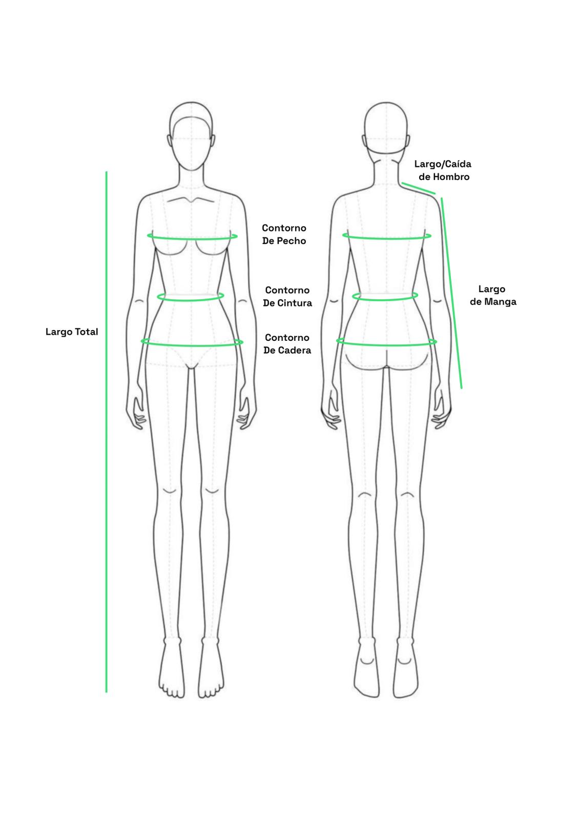 A continuación se presenta una guía clara y precisa para ayudarte a obtener tus medidas corporales de forma correcta. Te recomendamos utilizar una cinta métrica flexible y colocarte frente a un espejo para asegurar una lectura exacta.