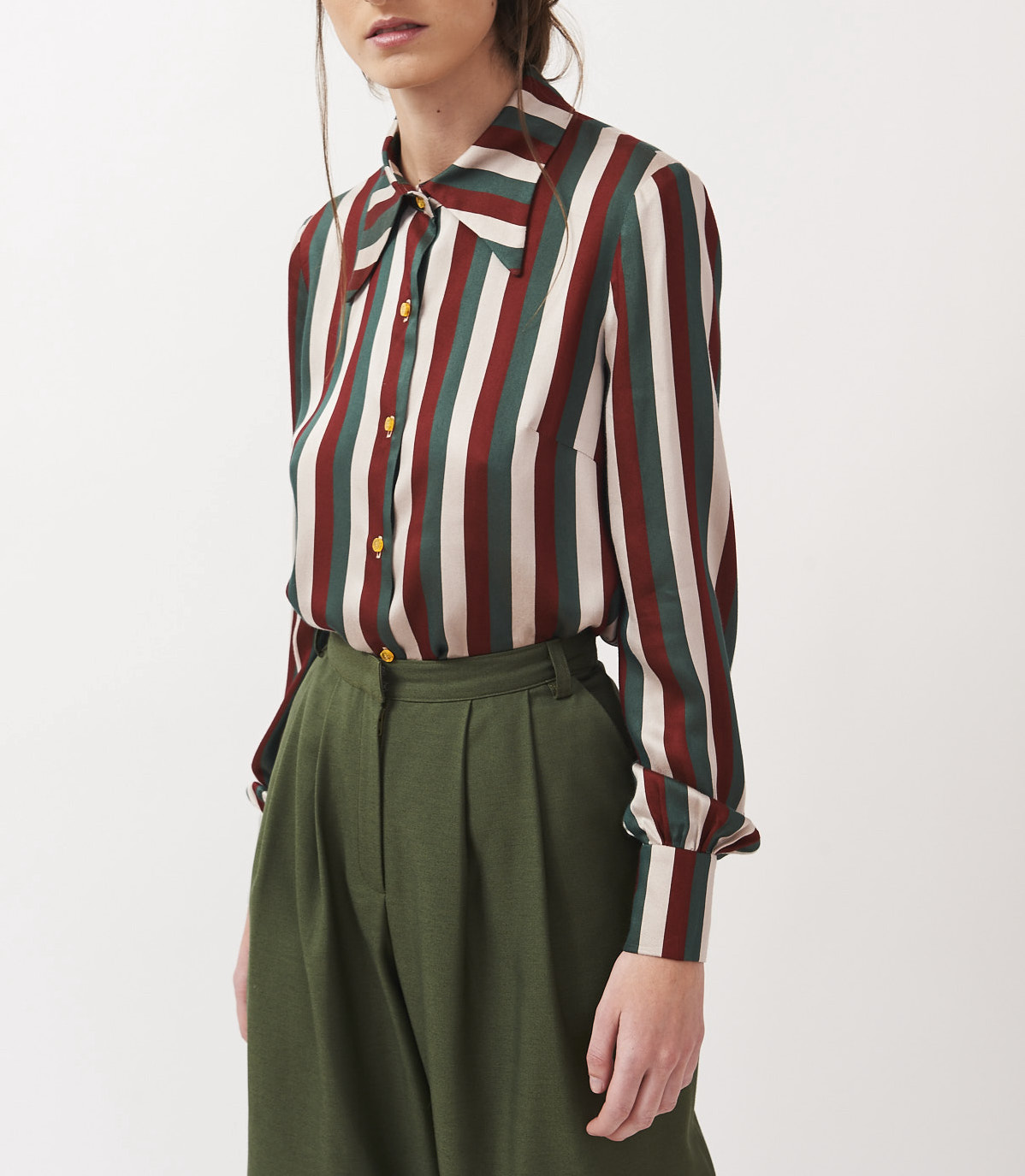 Camisa de viscosa con corte clásico, presenta un estampado de rayas verticales en tonos verdes, combinando rojo, verde y crema para un efecto vibrante y sofisticado. Presenta cuello camisero amplio, abotonadura frontal con botones a tono y puños estructurados decorados con varios botones a contraste. Una prenda versátil y llamativa, perfecta para aportar color y personalidad a cualquier look.