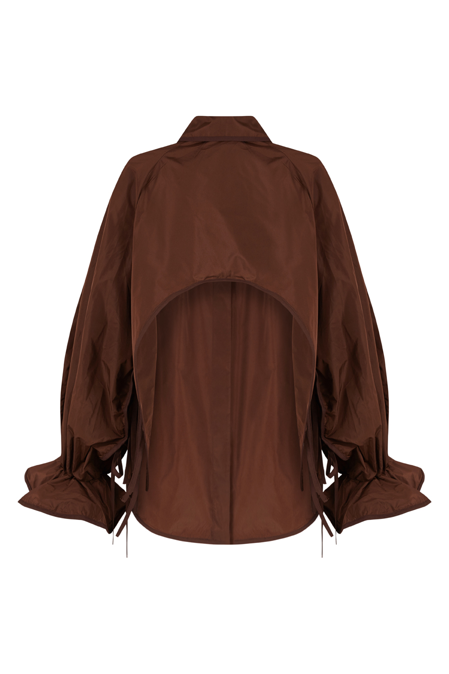 De manga larga abullonada acabada en puños con volante, largo total a cadera, espalda abierta, tapeta con botones invisibles en el delantero y cuello maxi ovalado. La camisa permite ser adaptada a todas las tallas por el sistema de cierre de sus costados abiertos con tiras multi-posición que además puede utilizarse a gusto del consumidor, permitiendo dar rienda suelta a la creatividad de cada uno.