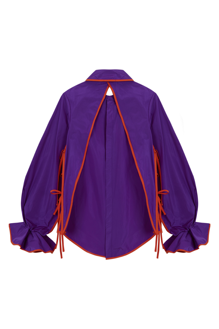 Camisa tafeta fina en color morado de poliéster y vivos de algodón en contraste de color naranja, manga larga abullonada acabada en puños con volante, largo total a cadera, espalda abierta en "U" invertida , tapeta con botones invisibles en el centro delantero y cuello maxi ovalado. La camisa permite ser adaptada a todas las tallas entre la talla 36 y la 42 por el sistema de cierre de sus costados abiertos con tiras multi-posición que además puede utilizarse a gusto del consumidor, permitiendo dar rienda suelta a la creatividad de cada uno.