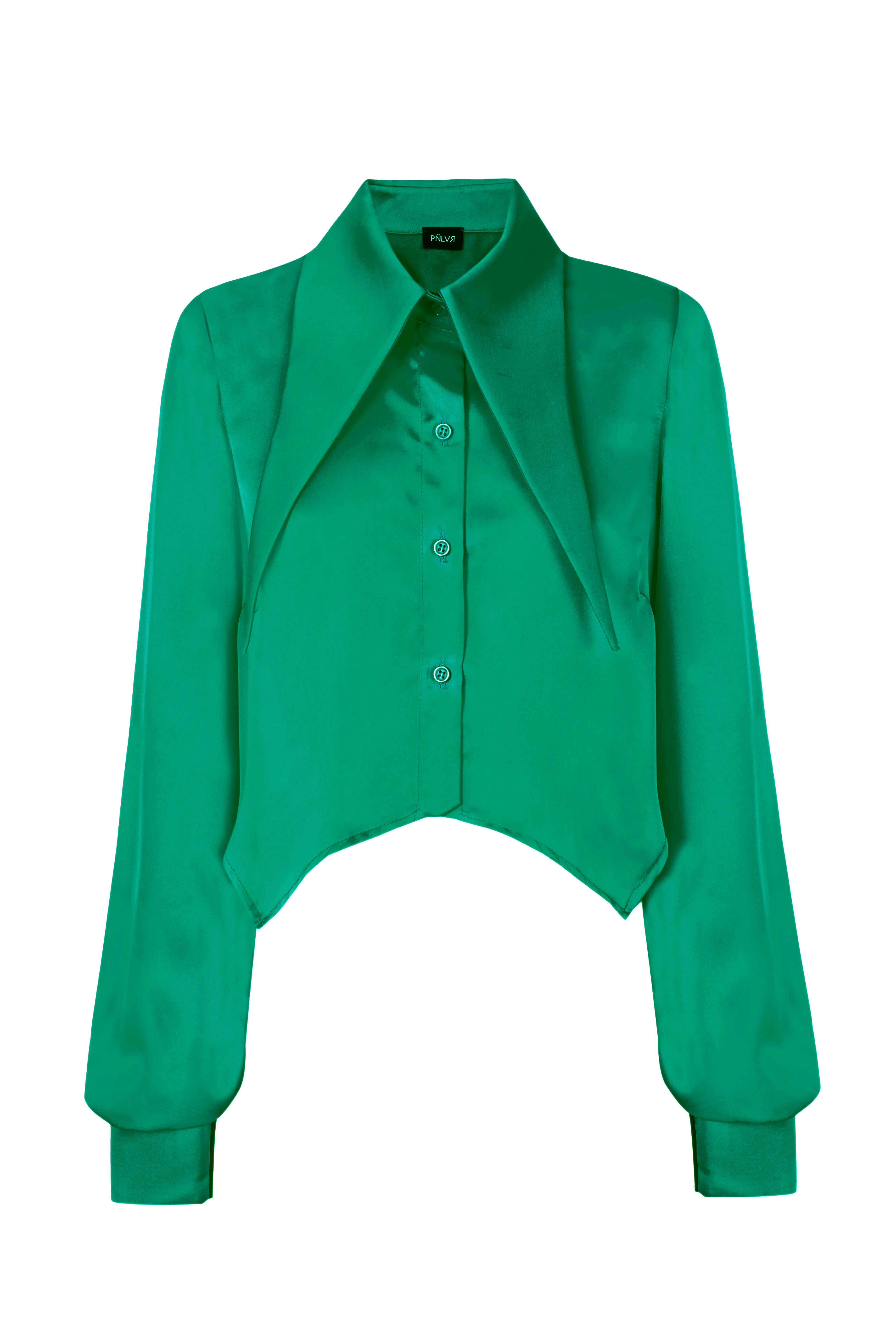 Camisa cropped en satén verde de caída fluida, diseñada con mangas abullonadas rematadas en un puño ajustado que aporta volumen y carácter. Su cuello alargado en picos —uno de los detalles icónicos de la firma— añade un toque distintivo, convirtiéndola en una prenda versátil y llamativa tanto para eventos especiales como para combinar con otras capas.