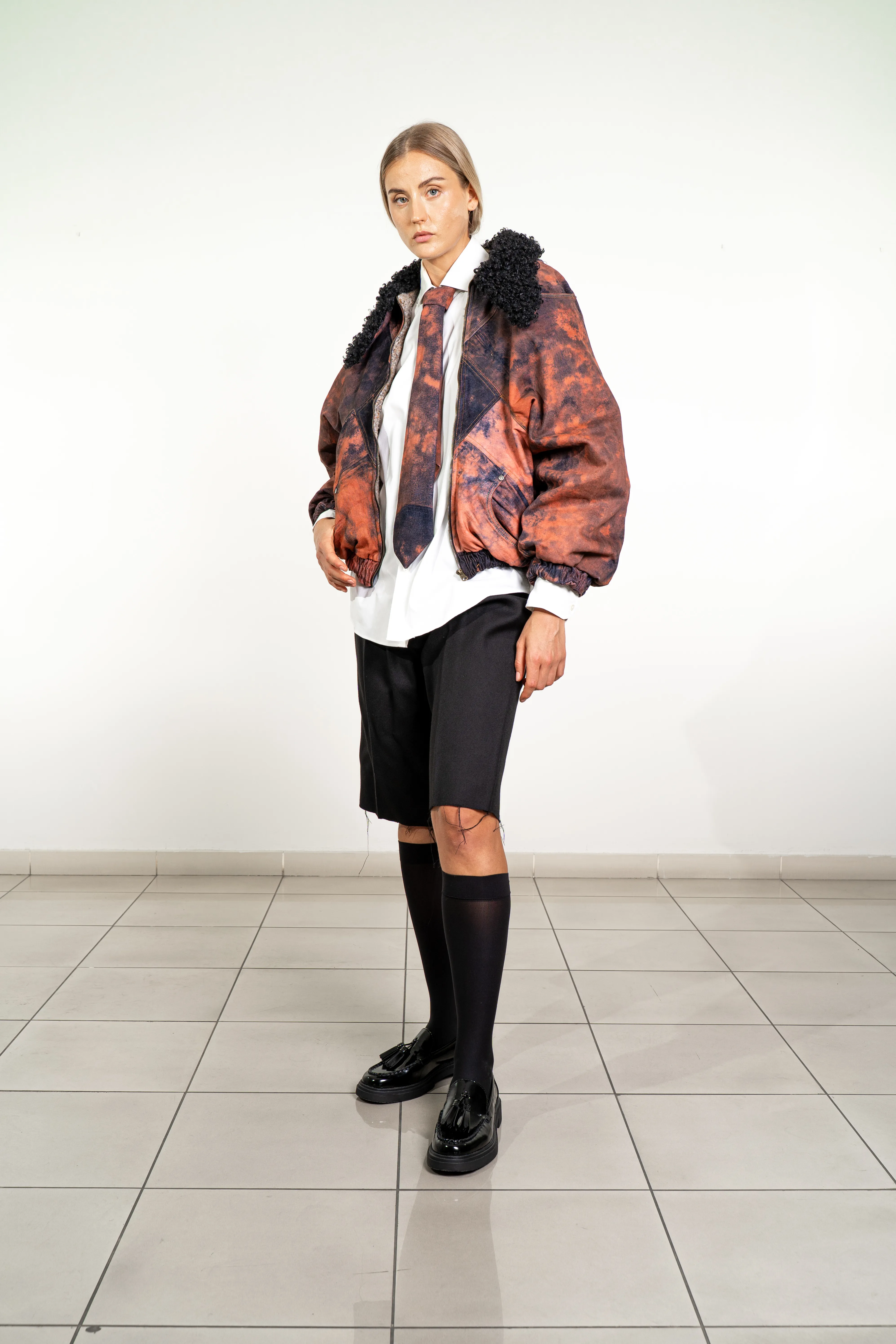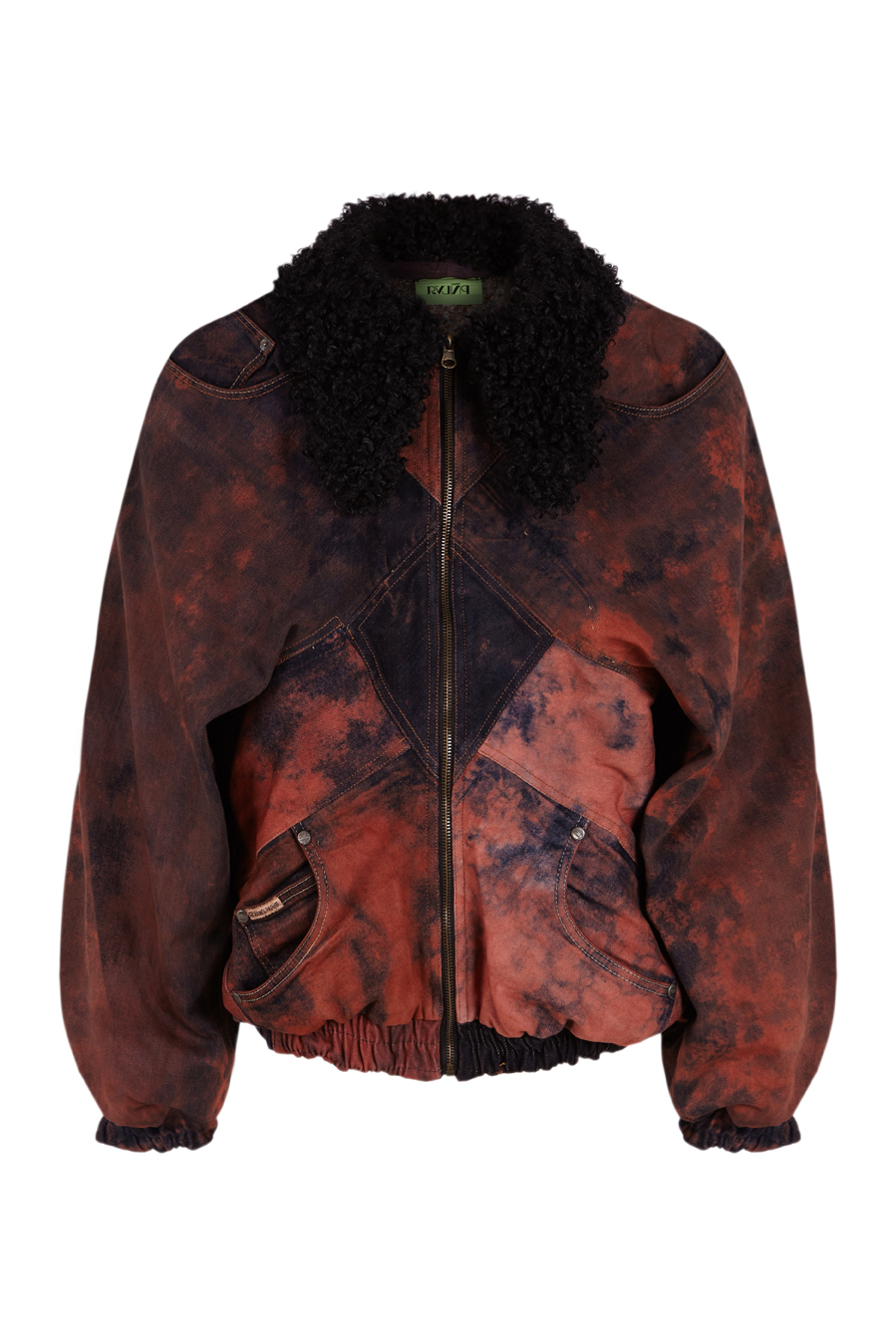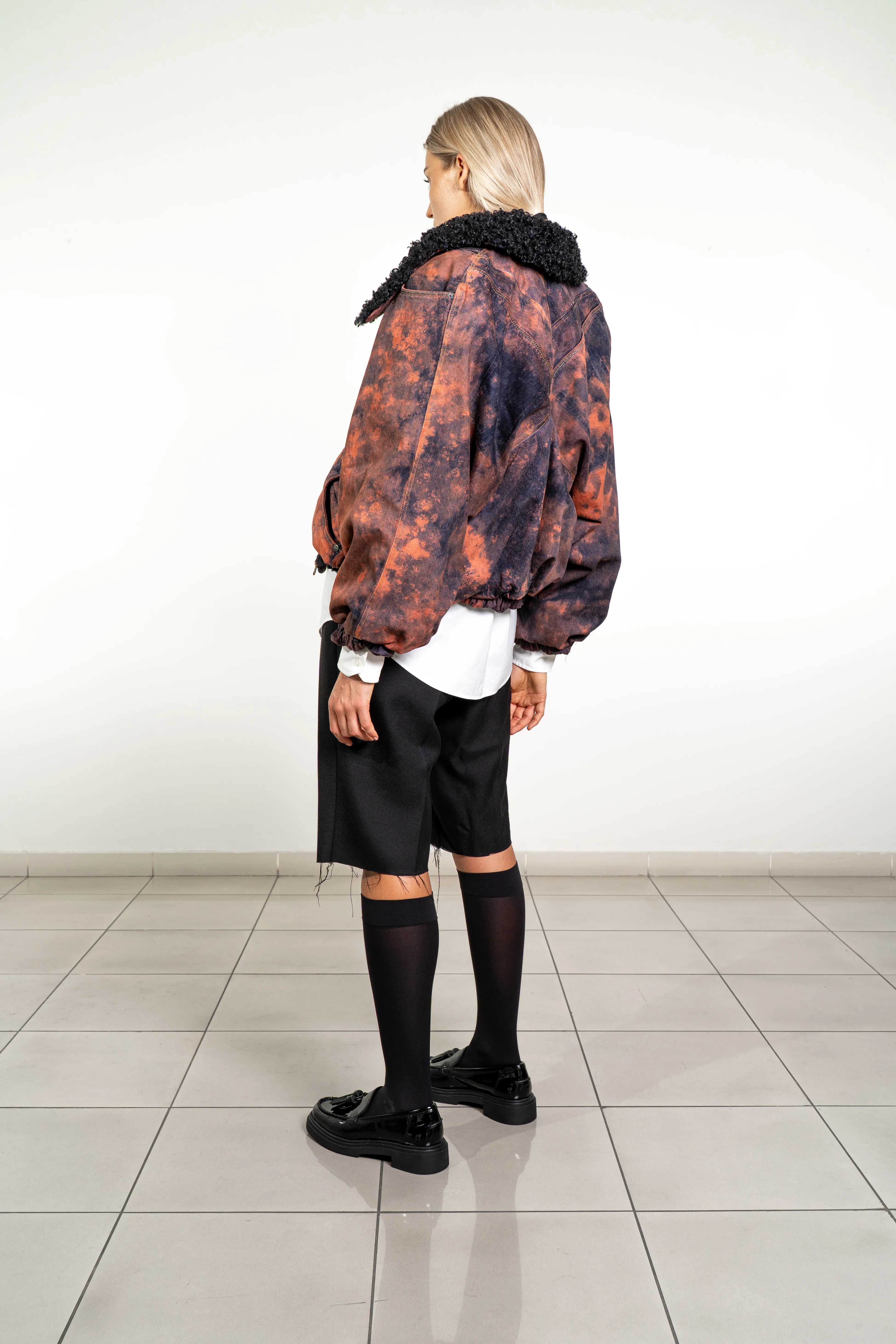 Chaqueta vaquera upcycled de corte cropped con un acabado artesanal en tonos teja, óxido y azul profundo, resultado de un proceso de desteñido y tintura que convierte cada pieza en un diseño completamente único. El cuello destaca por su textura rizada tipo borreguito en negro, que aporta volumen, contraste y un aire sofisticado.