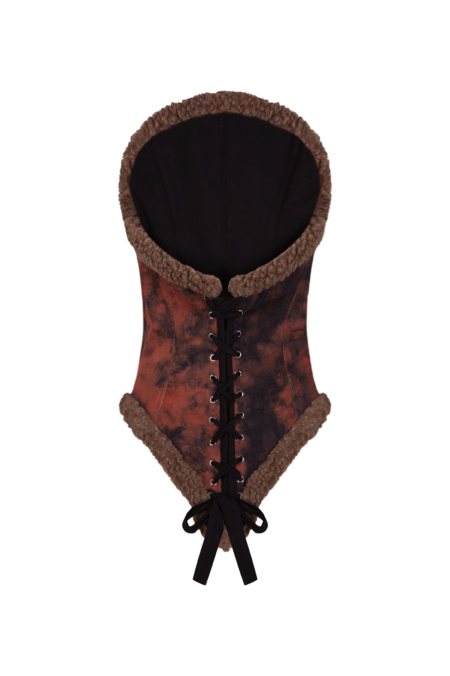 Corsé upcycled con escote subido y silueta estructurada que realza la figura. Elaborado a partir de vaqueros de segunda mano teñidos en tonos rojizos y negros, presenta un acabado moteado con un carácter artesanal único.
