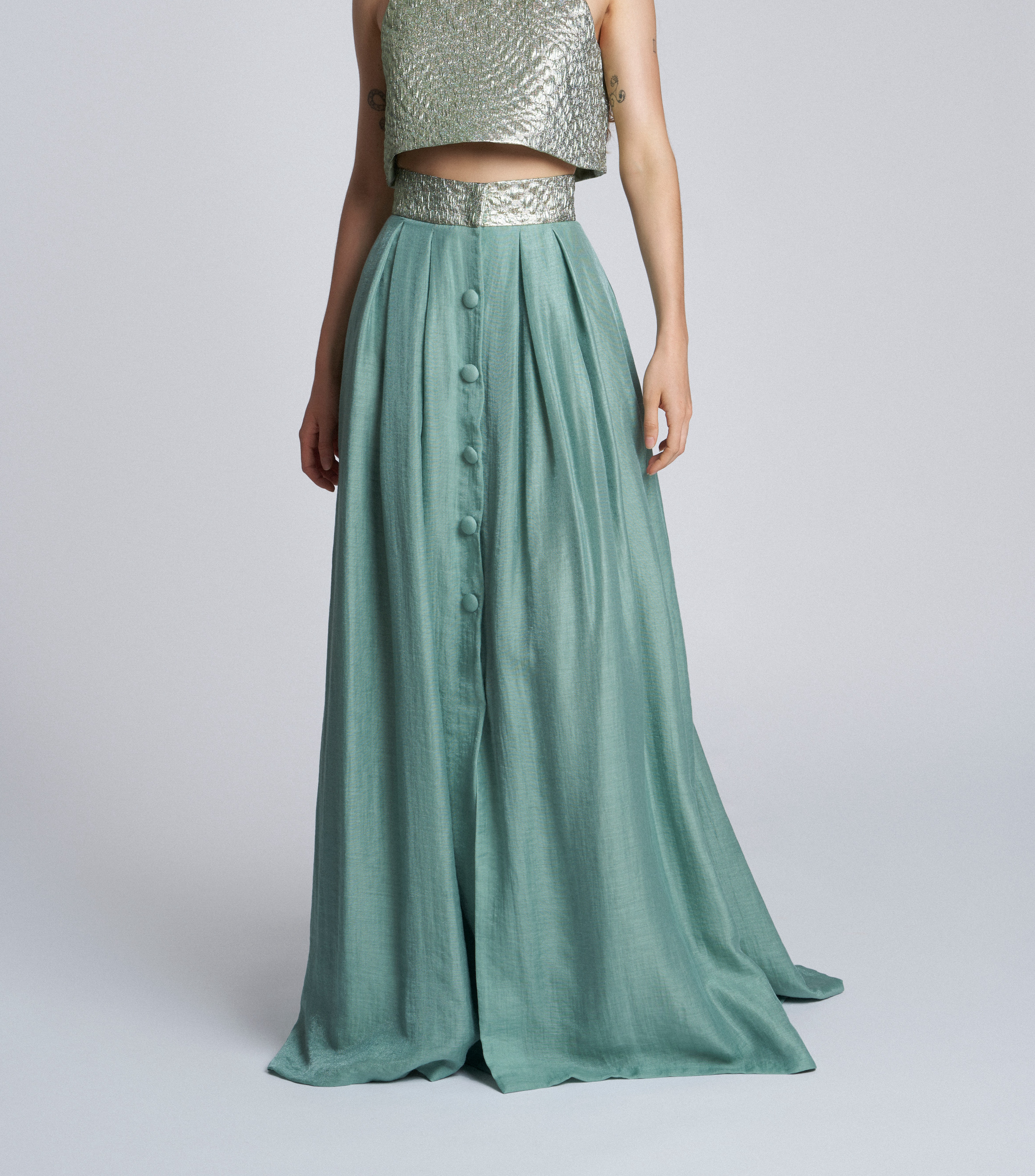Falda larga y fluida con una línea de botones frontales que se abre sutilmente al caminar, aportando movimiento y un toque seductor. Confeccionada en viscosa semibrillante, destaca por el contraste con su cinturilla texturizada y luminosa, que enmarca la silueta y eleva el diseño con un acabado sofisticado.