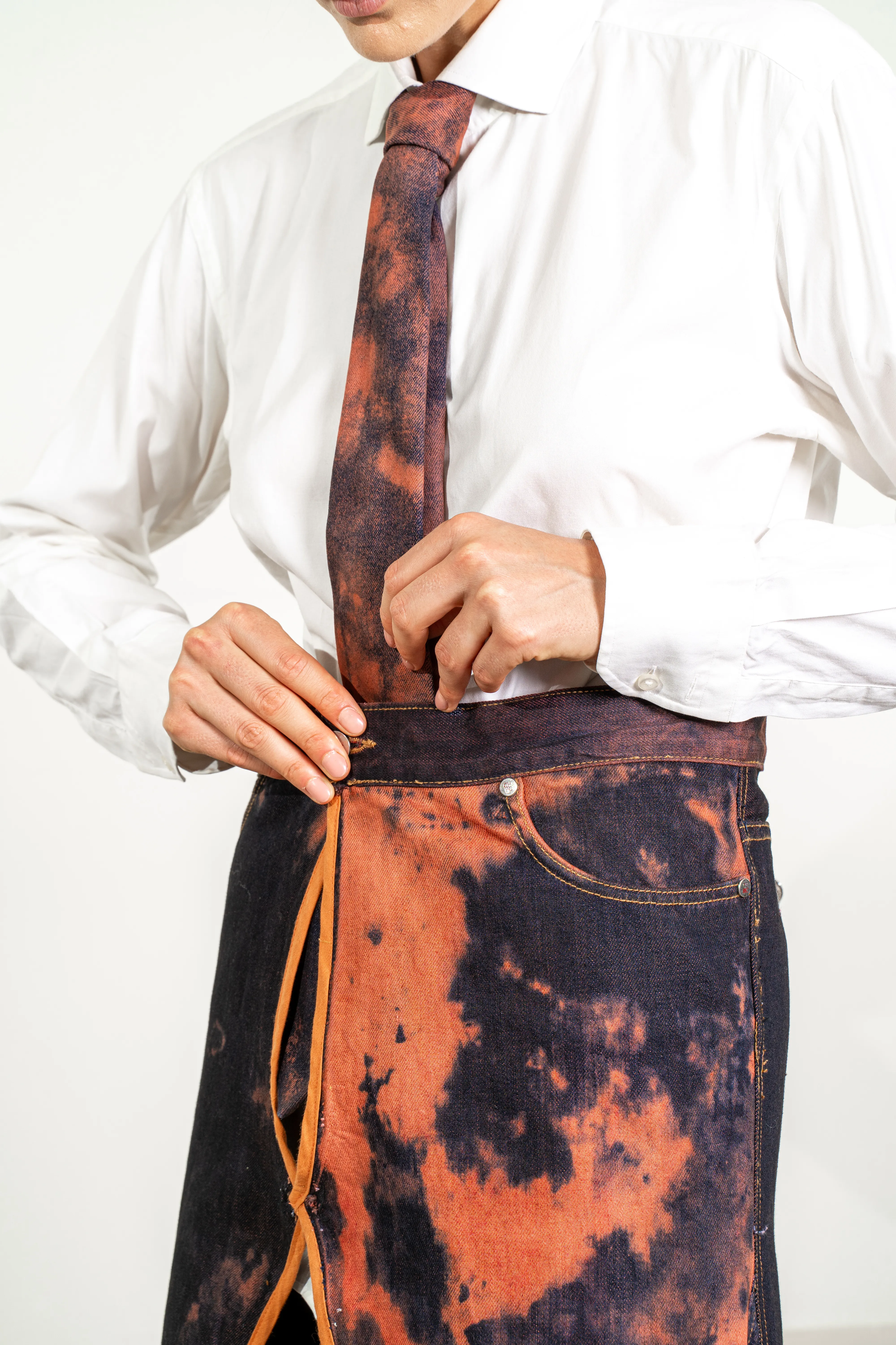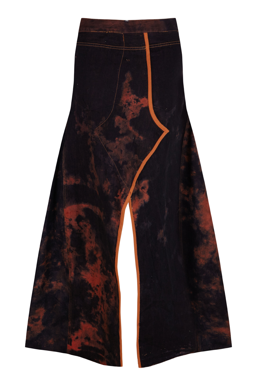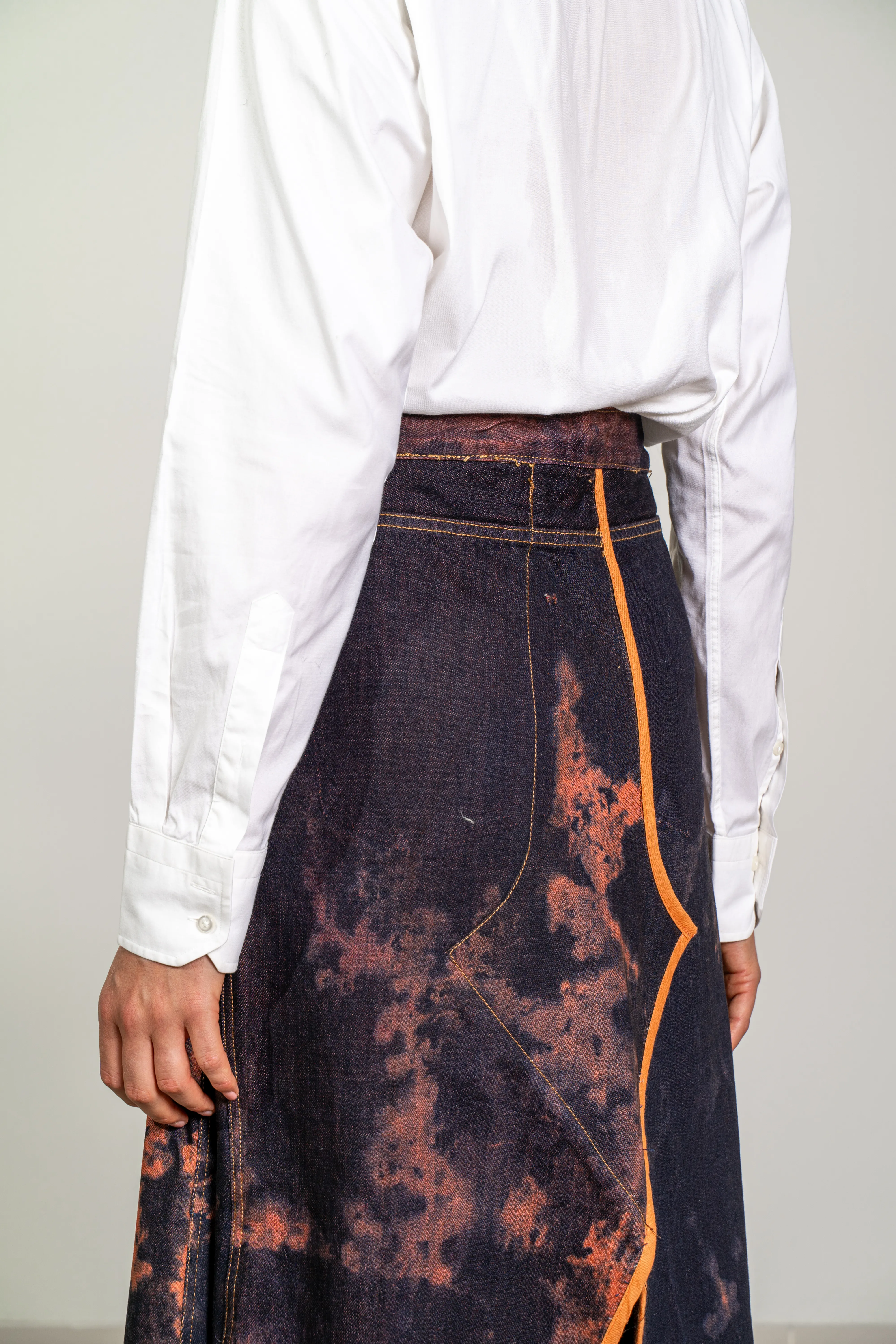 Pantalón vaquero vintage desmontado y volteado para transformarlo en una falda larga, con aberturas tanto en el delantero como en la espalda a partir de las rodillas. El proceso de teñido es totalmente manual.
