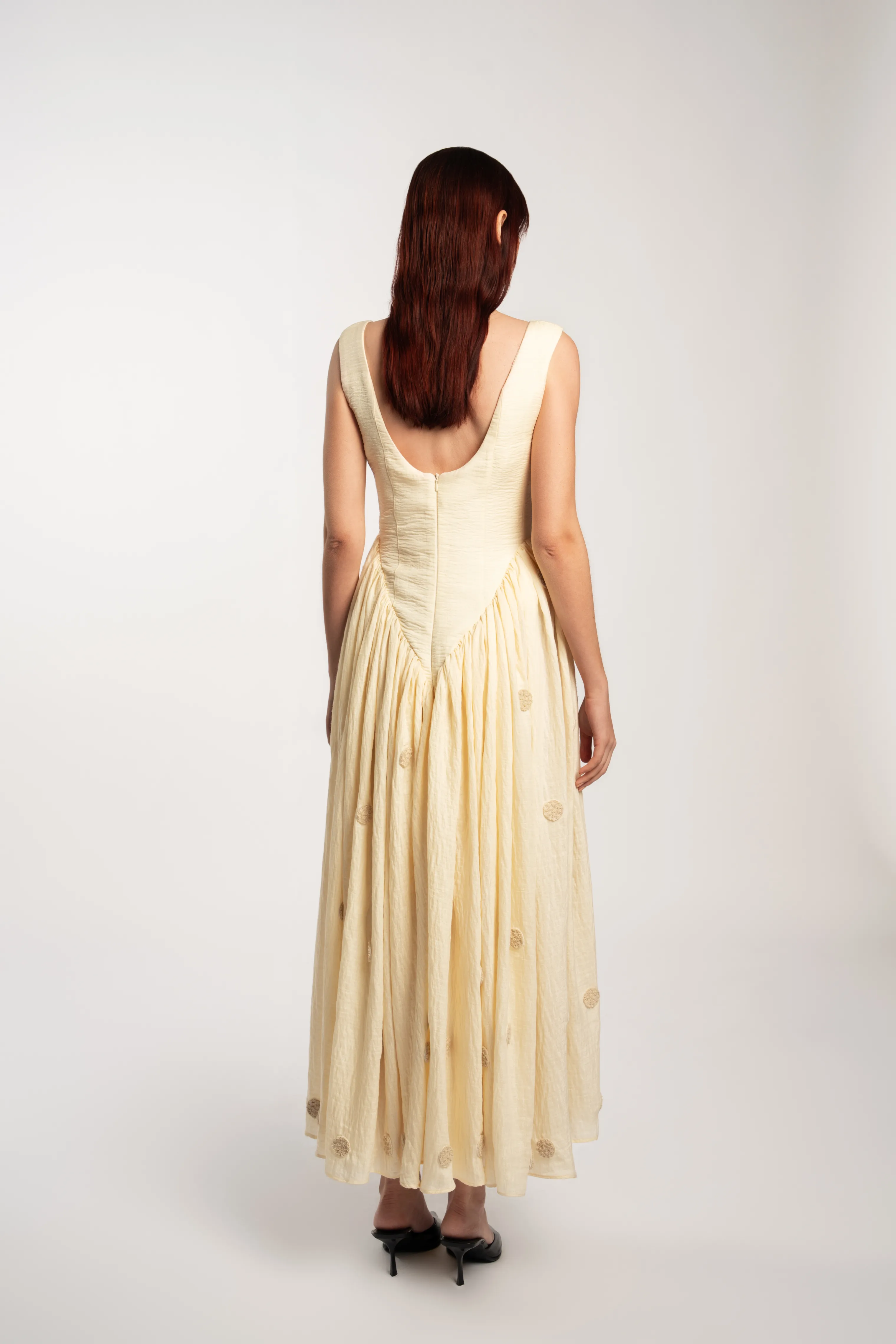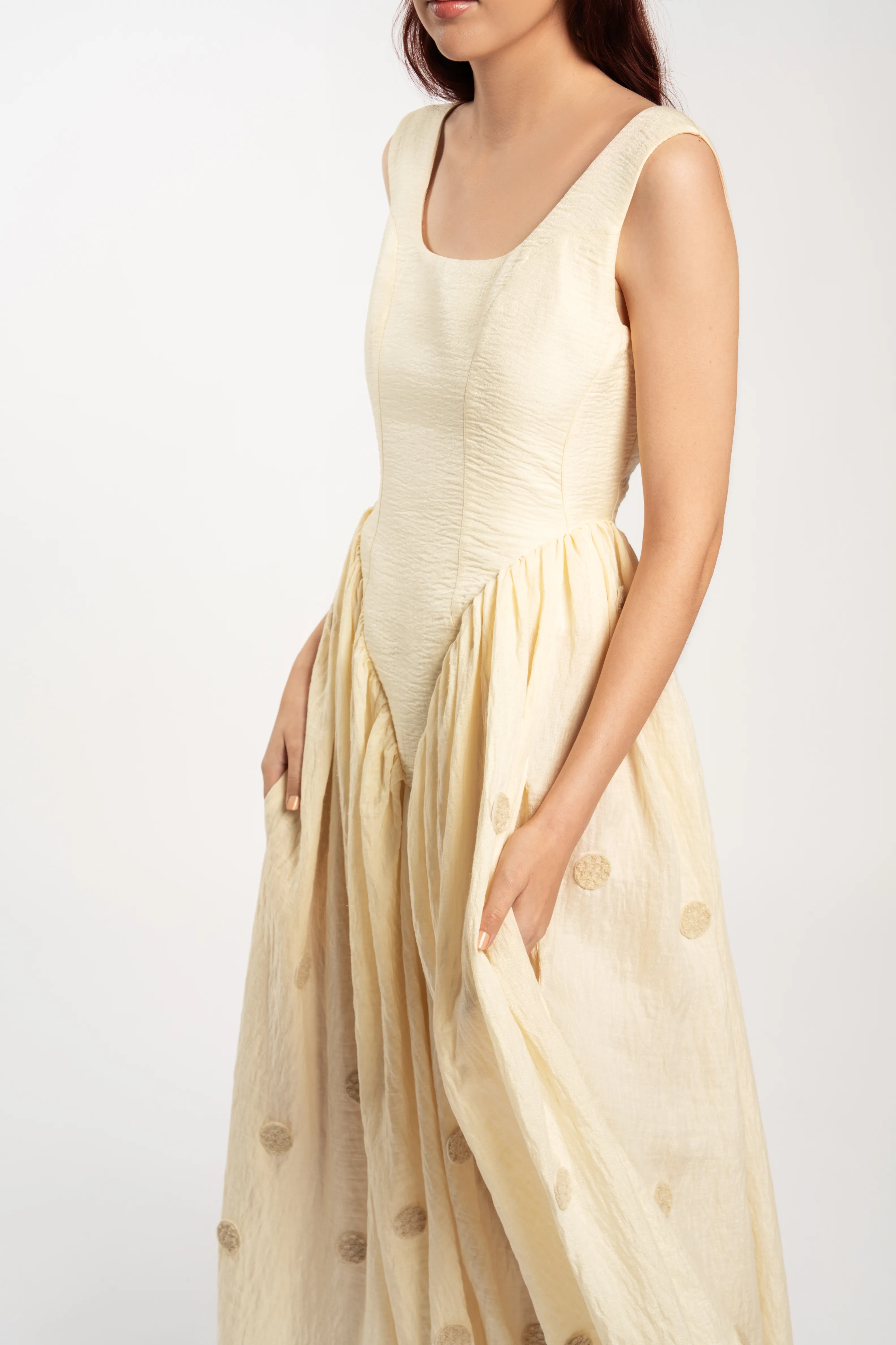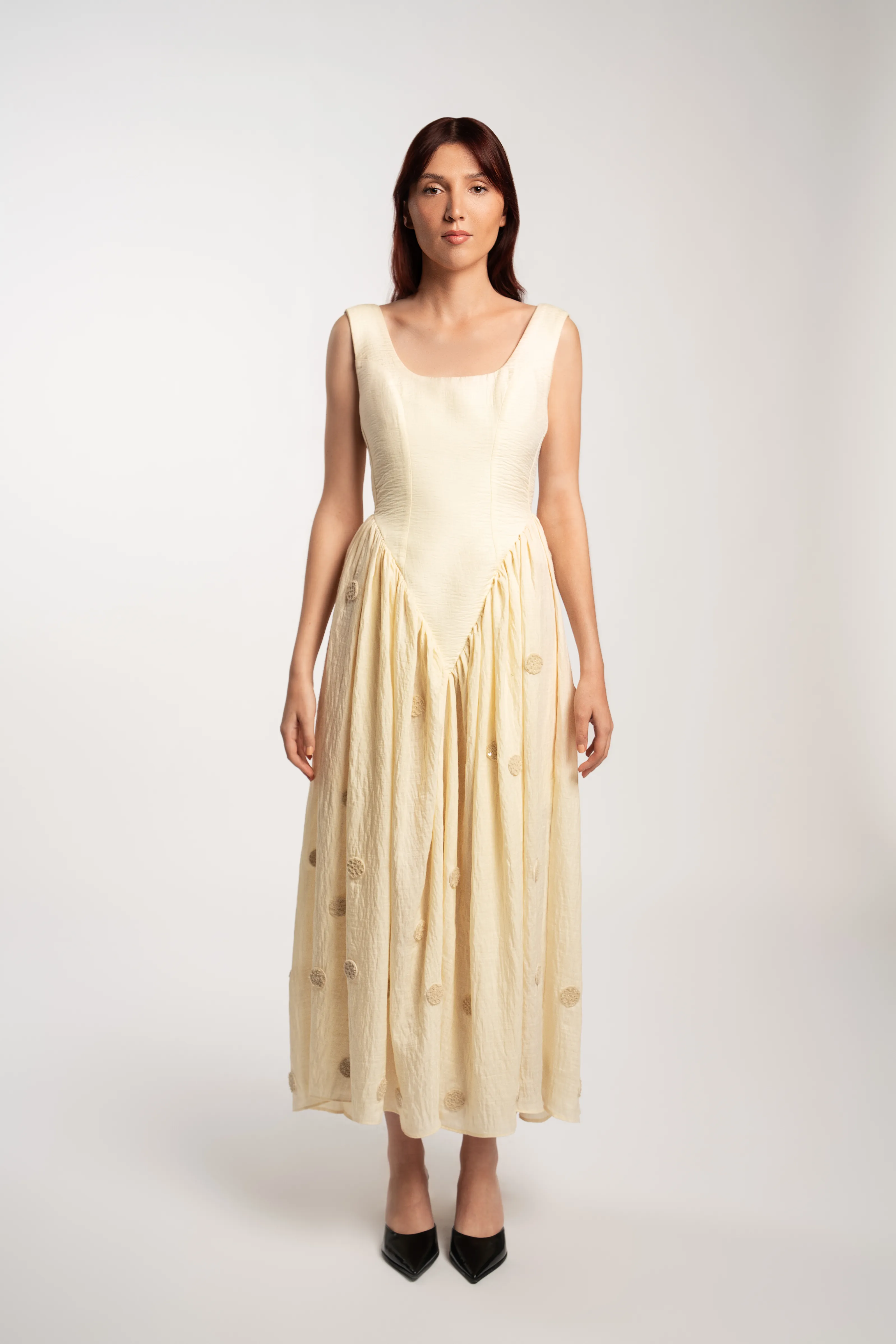 Vestido midi estilo corsé en tono beige, con una estructura que resalta por su corte en pico a la altura de la cintura. Este vestido se combina con una falda fluida, delicadamente fruncida, adornada con lunares bordados con detalles de lentejuelas que aportan un toque de sofisticación.