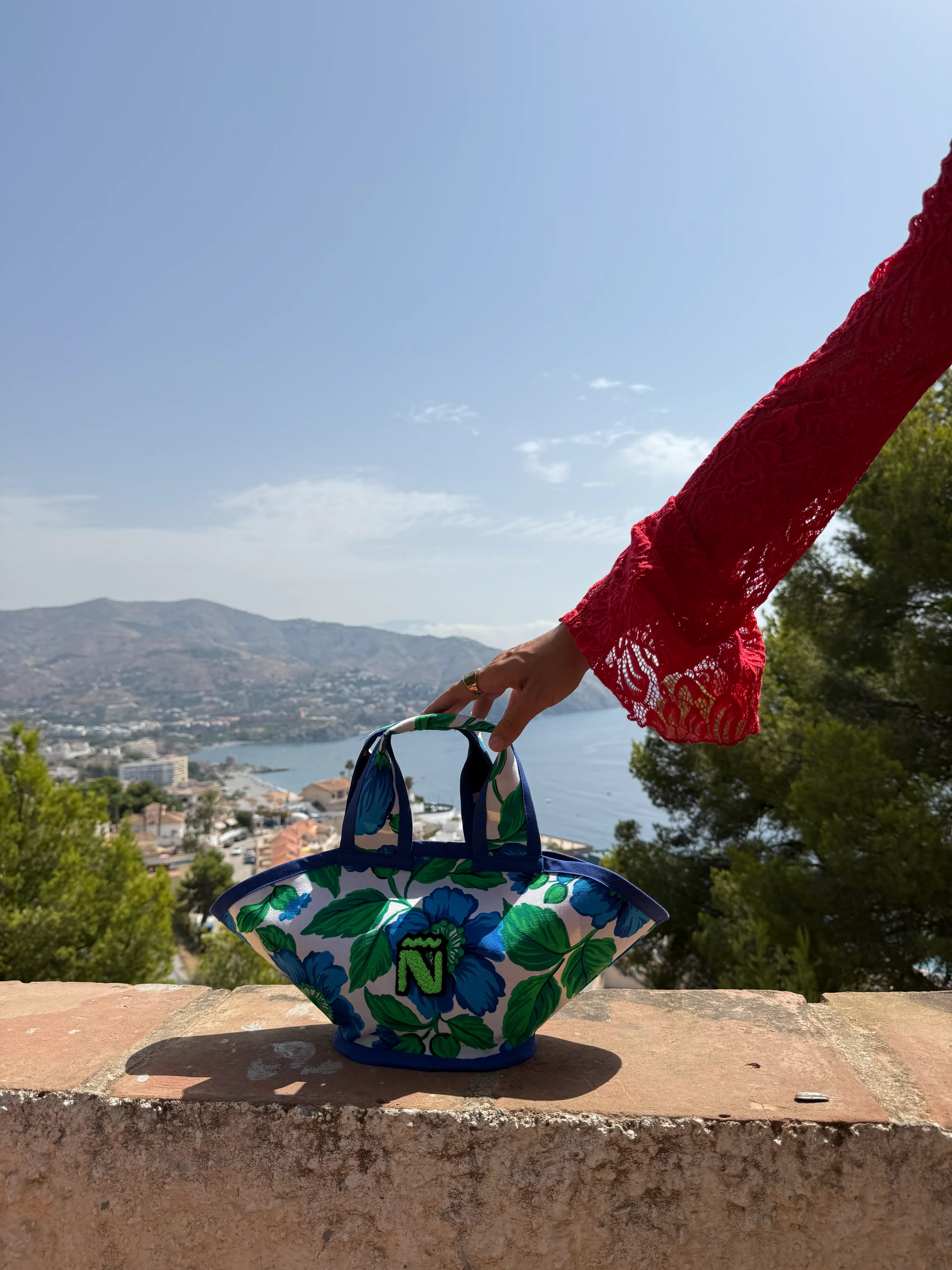 Capazo pequeño en estampado, con logo en relieve y remates de bies en azul eléctrico. Su interior cuenta con un estampado de rayas retro y tiene un cierre con botón. Confeccionado con tejidos de toldos reciclados mediante la técnica upcycling, en colaboración con Toldos y Lonas López.