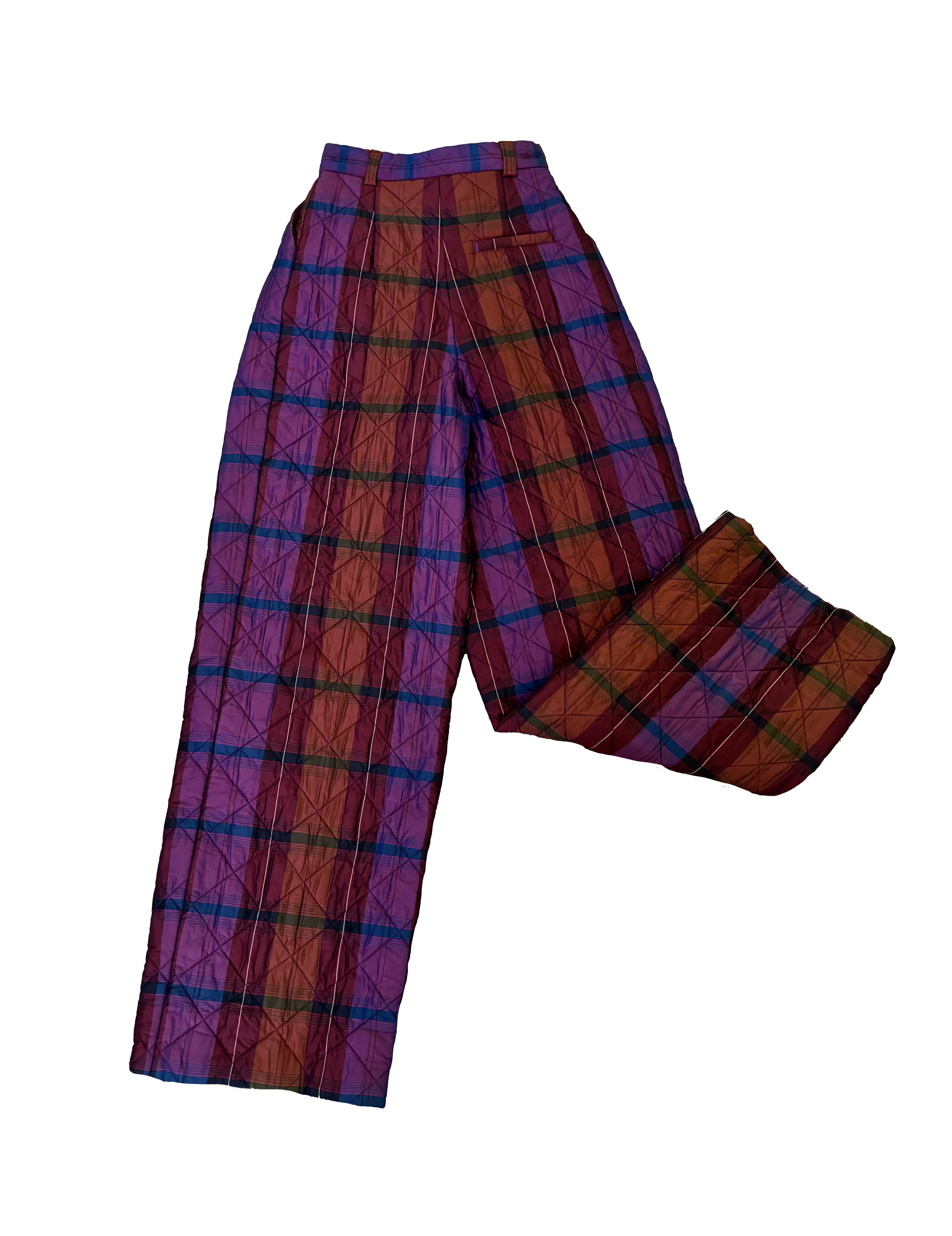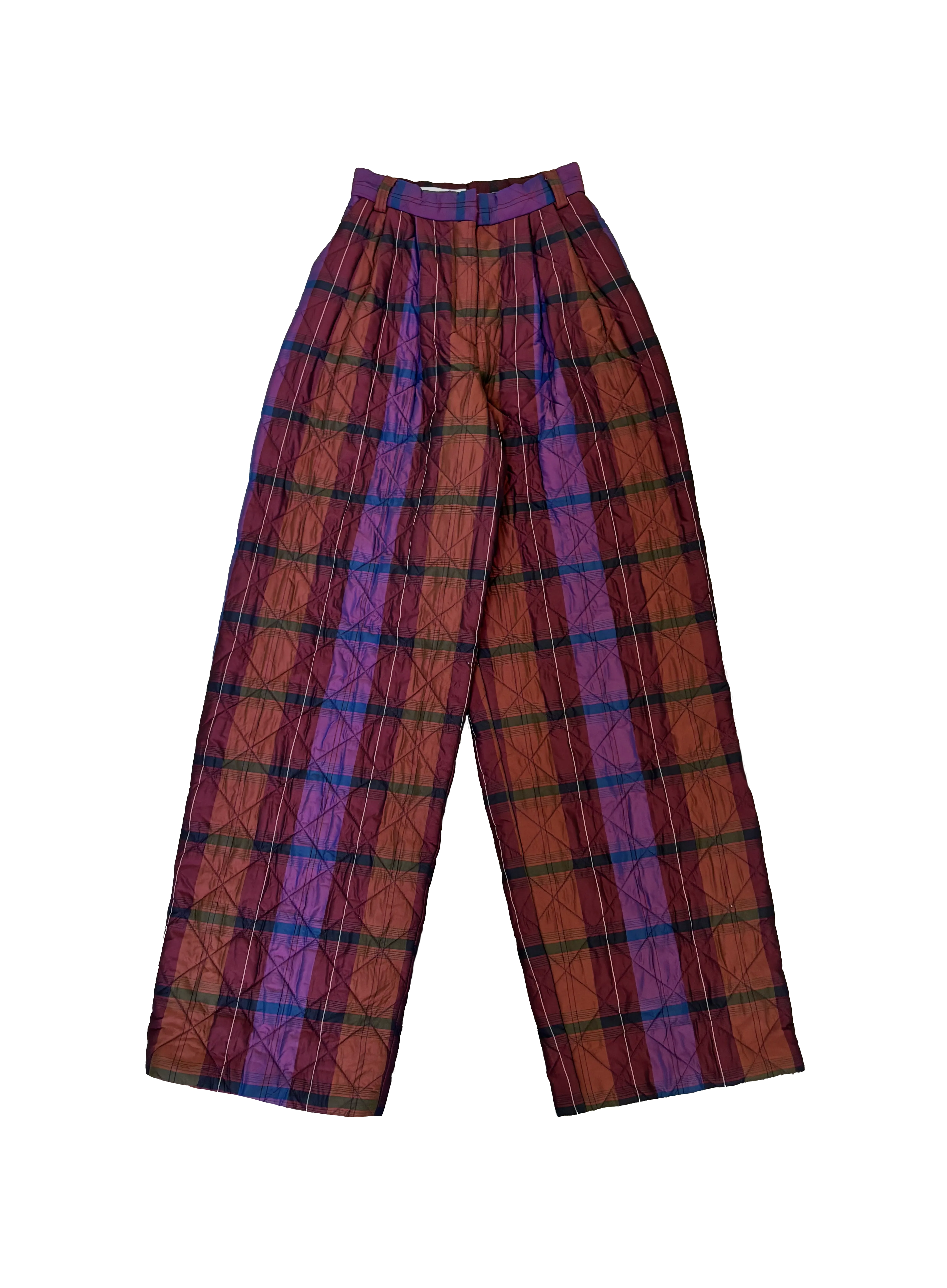 Pantalón acolchado de cuadros en tonos burdeos y morado, con corte amplio y cintura alta que aporta comodidad y un fit moderno. Su tejido acolchado ofrece calidez sin perder ligereza, perfecto para climas de nieve.