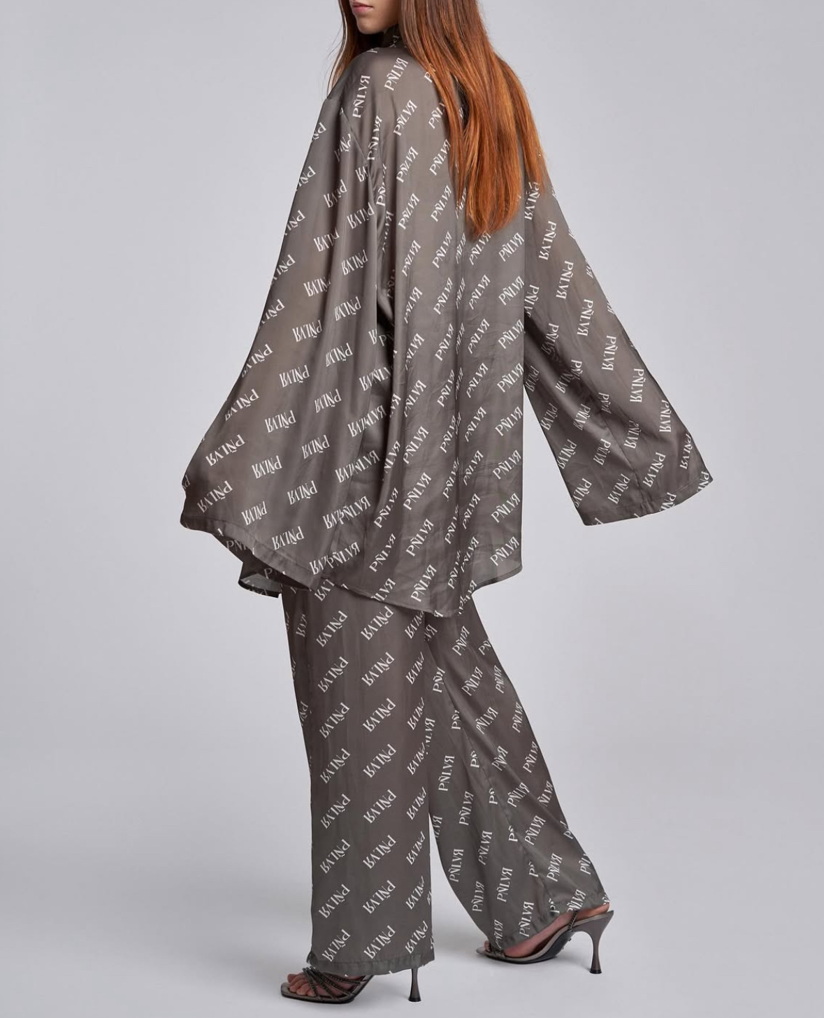 Total look de dos piezas de camisa y pantalón en estampado monograma de fondo gris y logo en color blanco. De silueta oversize y pantalón ajustable con bolsillos. Tejido 100% poliéster con tacto tipo pañuelo de seda.