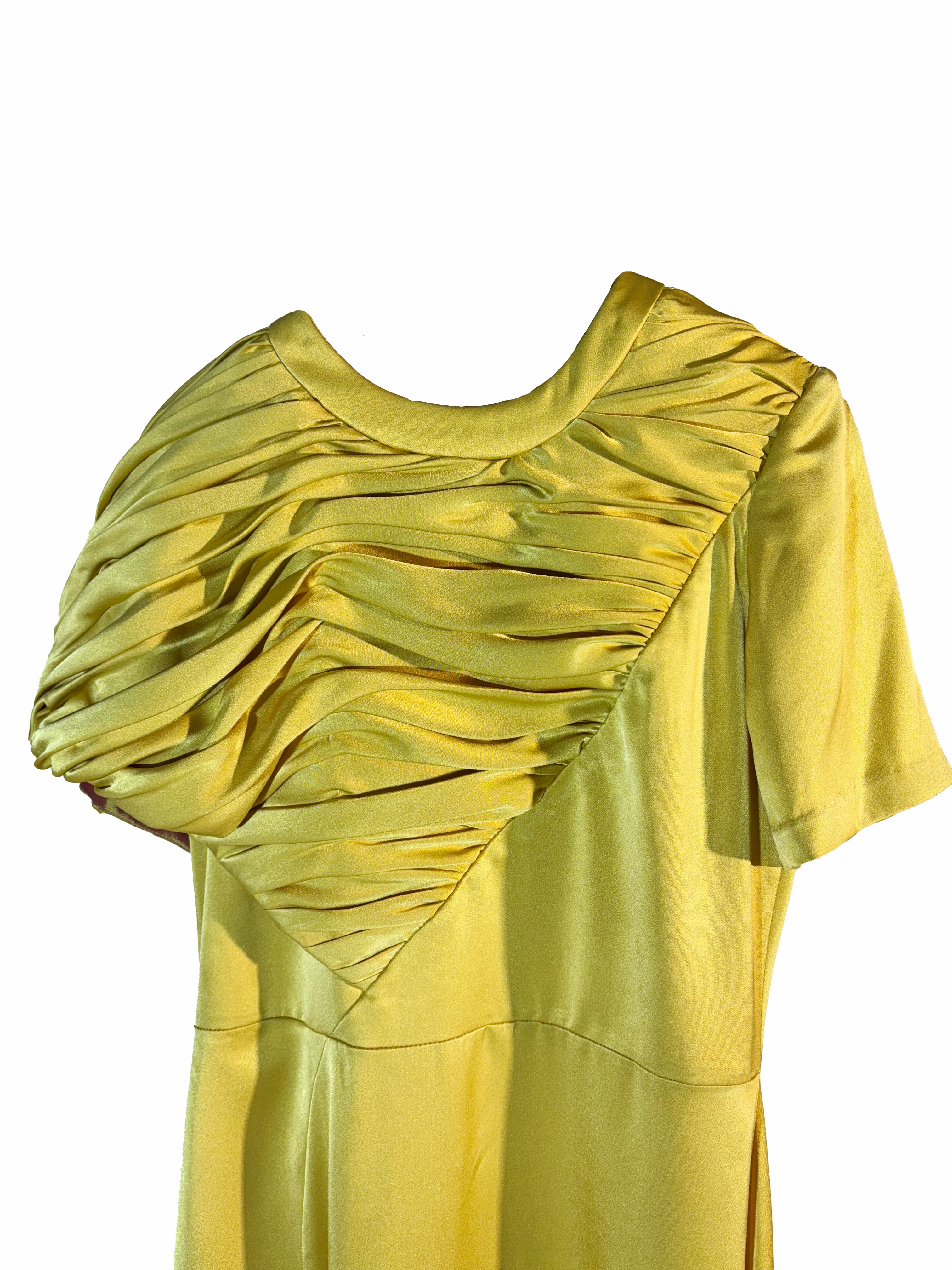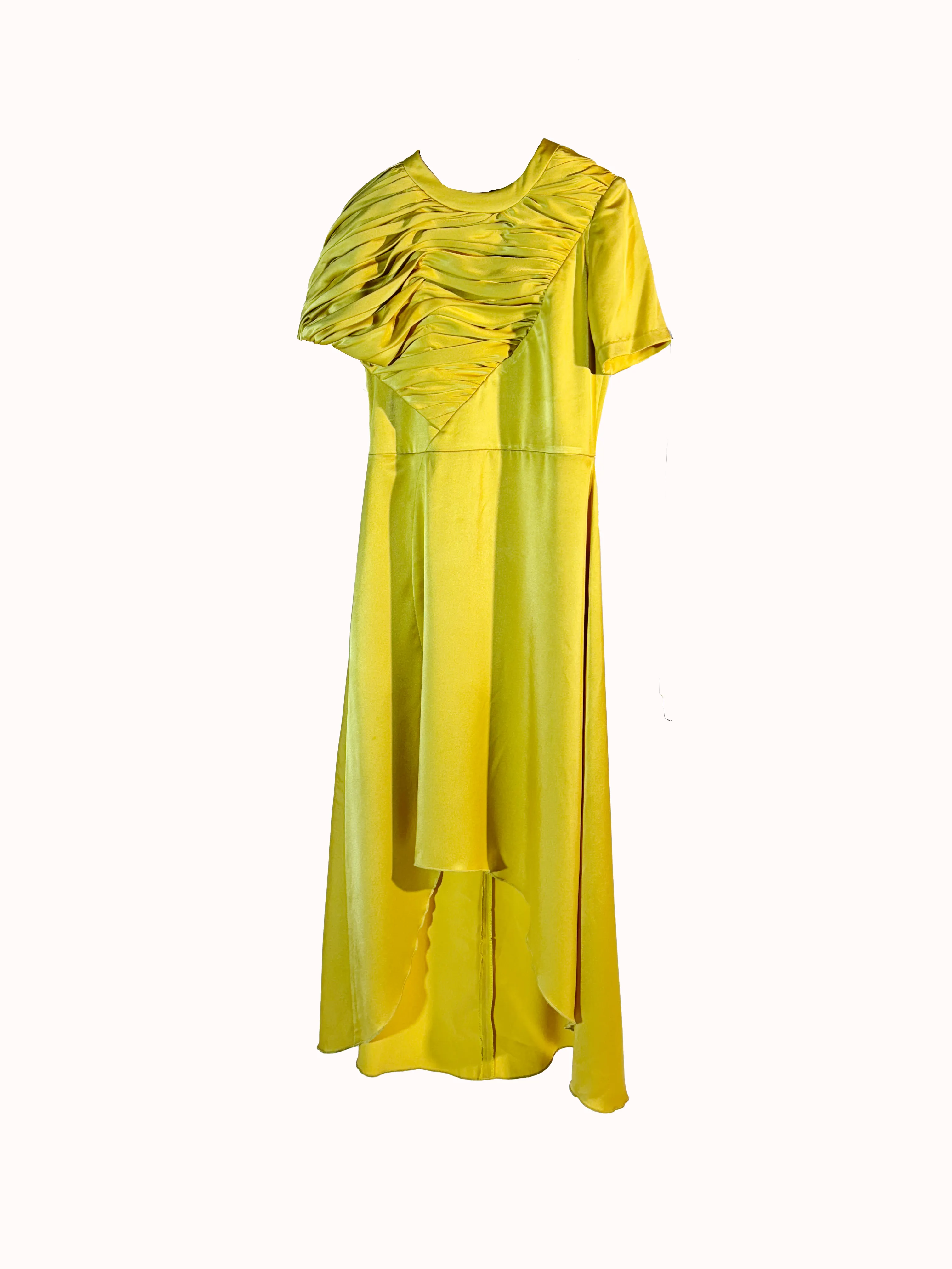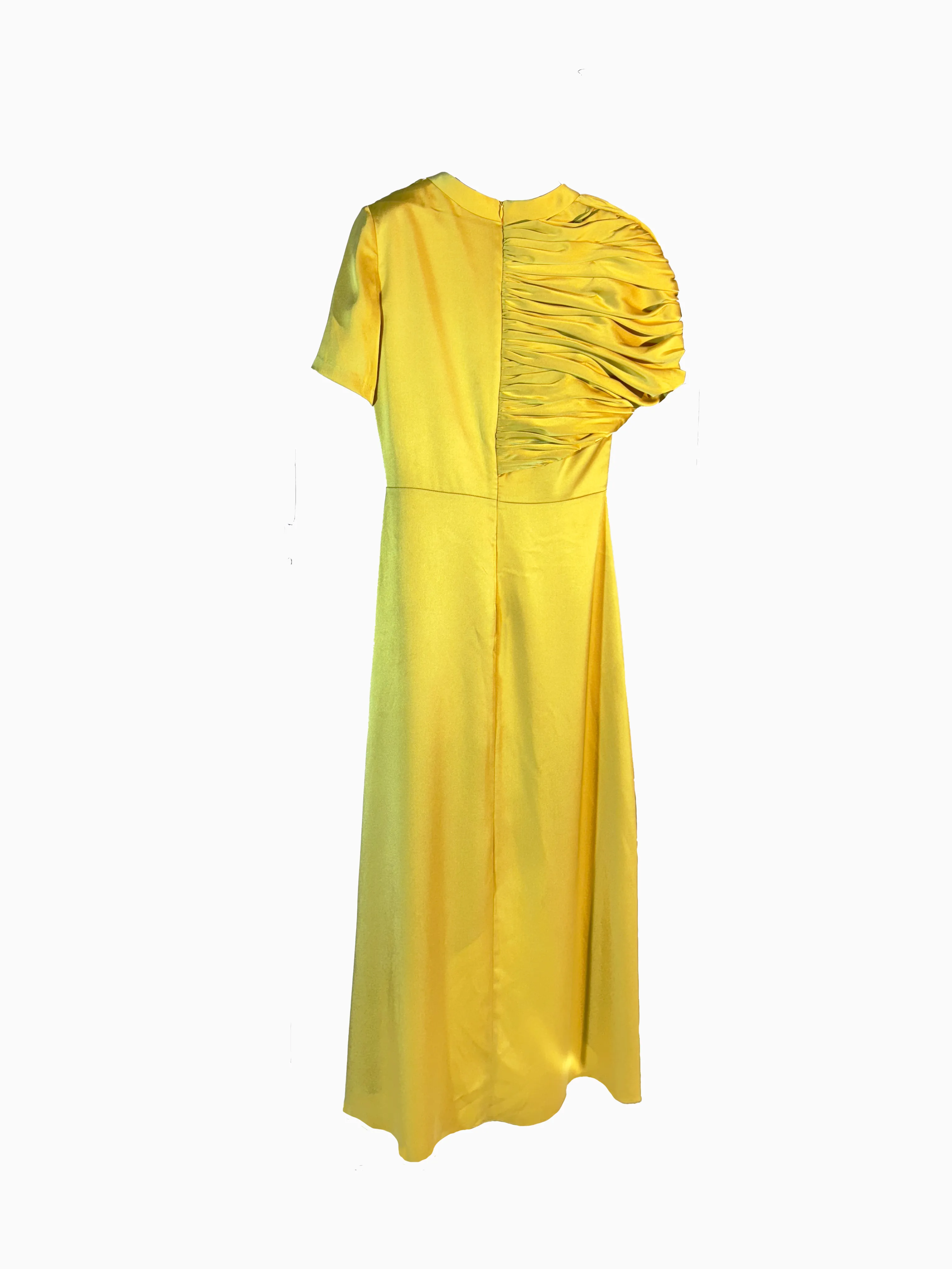 Vestido icónico de nuestra colección Guateque, con corte midi en satén amarillo con un diseño asimétrico y un drapeado estructurado que cruza el pecho y el hombro, aportando volumen y un efecto escultórico. La falda cae con movimiento fluido y cuenta con una abertura lateral pronunciada que estiliza la figura y añade un toque sofisticado. El cinturón visible en la imagen no está incluido.