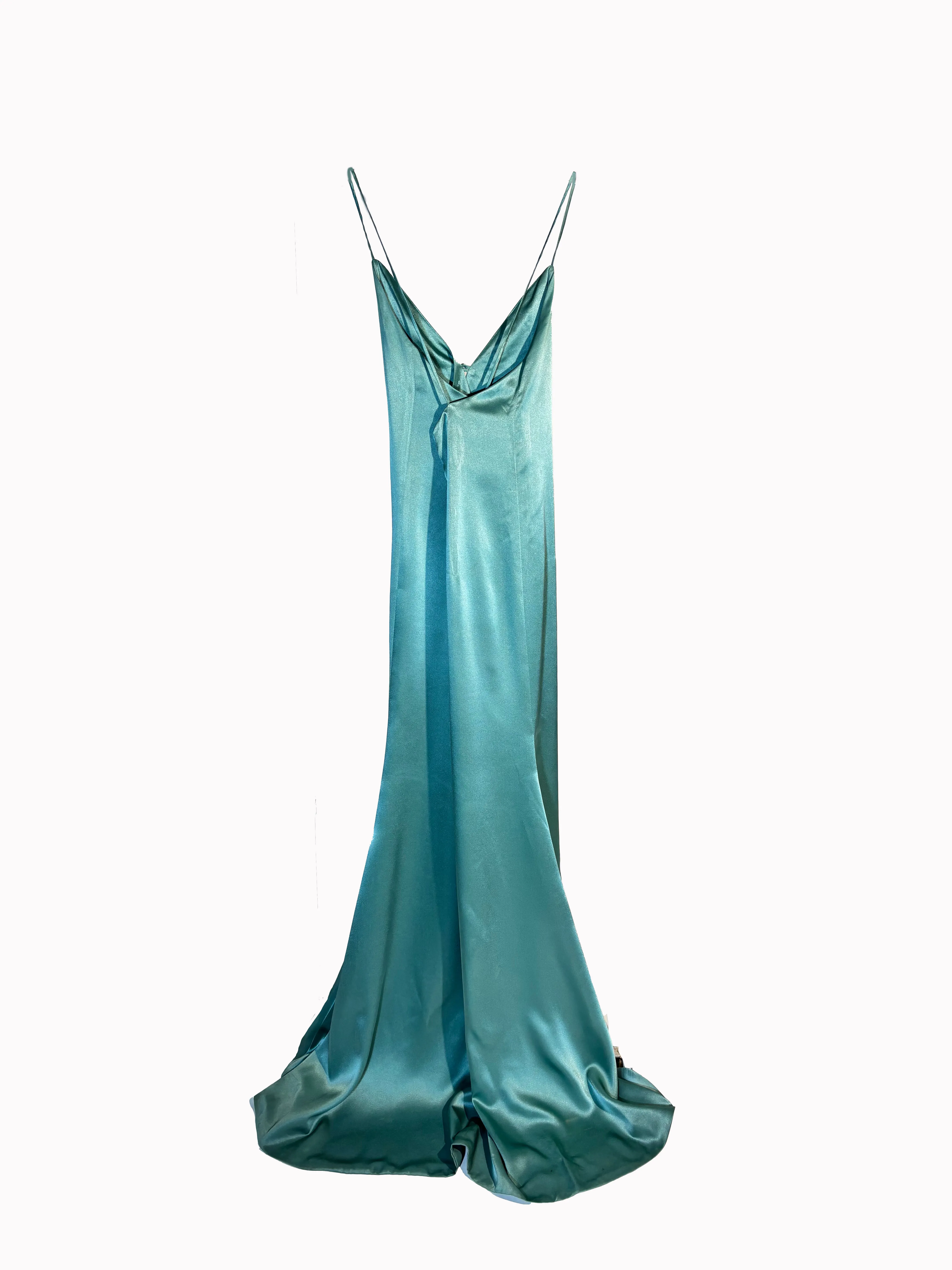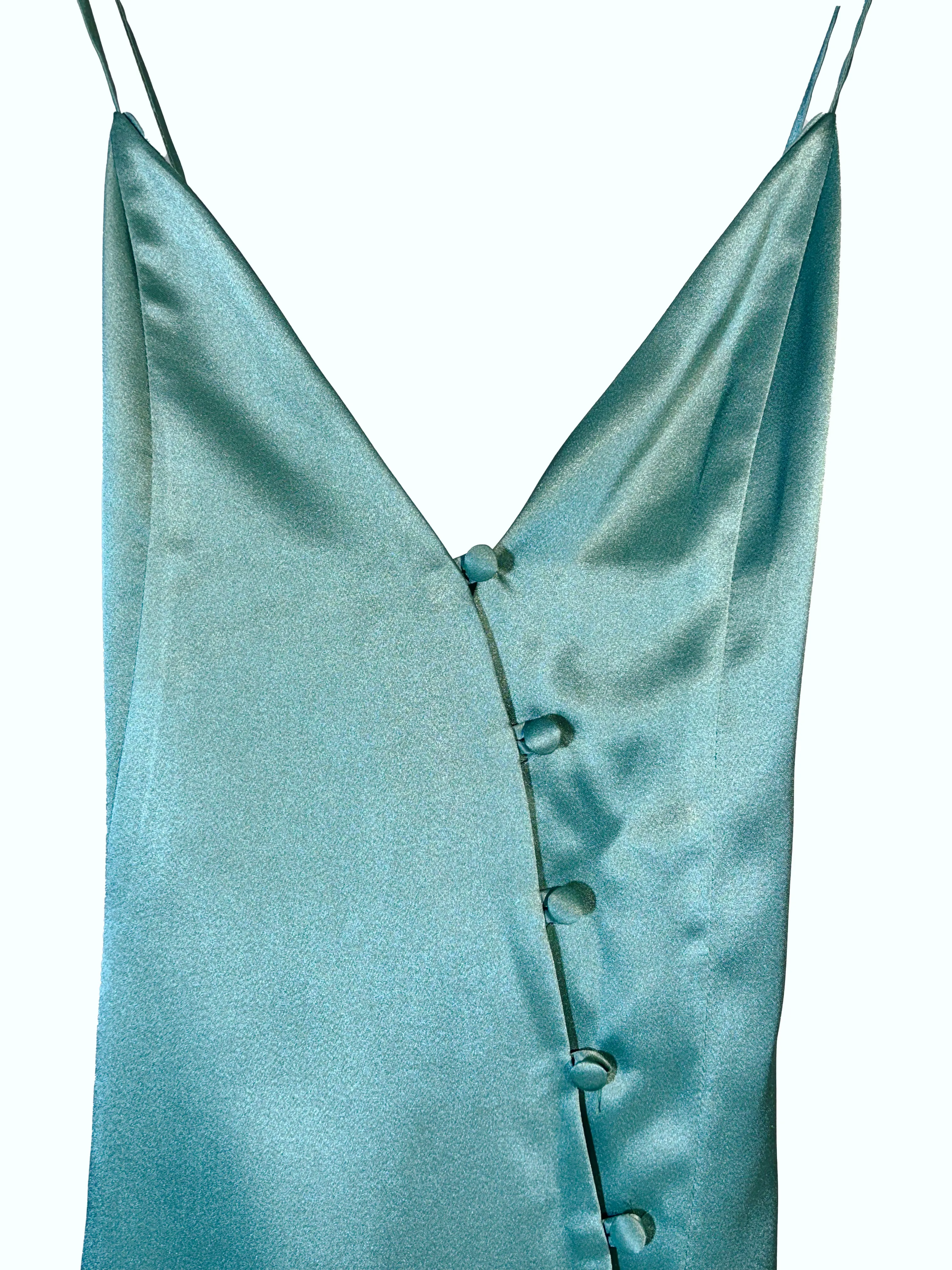 Vestido lencero abotonado en la parte delantera, diseñado con apertura de corte asimétrico que crea un efecto visual estilizado. Sus finos tirantes y el escote en V poco pronunciado realzan la figura de manera delicada, mientras que el largo asimétrico aporta un toque elegante y sofisticado.